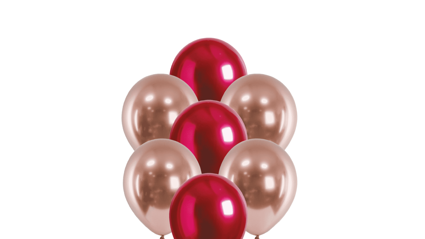 This stunning arrangement features seven shimmering rose gold and pomegranate chrome helium latex balloons (30cm).