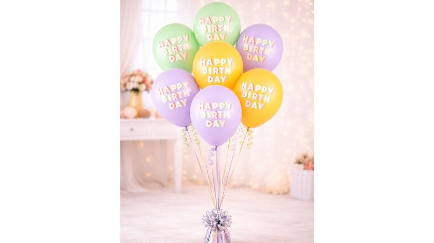 Brighten any birthday celebration with this cheerful pastel balloon bouquet. Featuring a beautiful mix of mint green, yellow, and lavender balloons, each printed with colorful “Happy Birthday” lettering, this arrangement creates an eye-catching and joyful centerpiece.