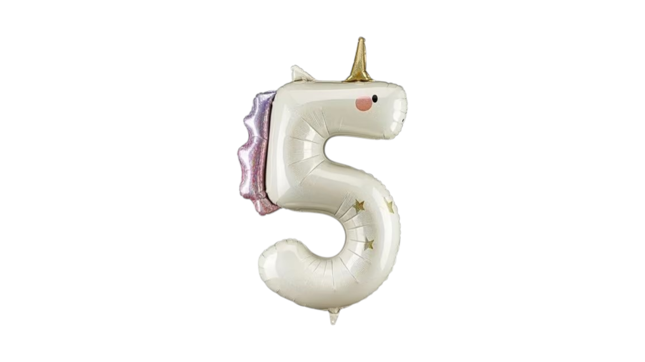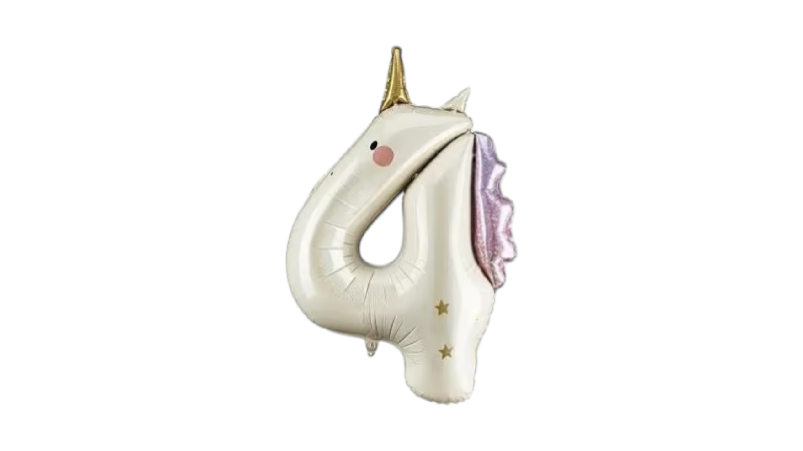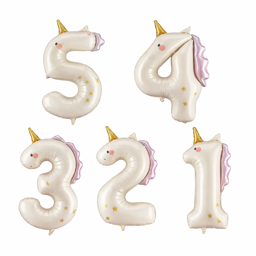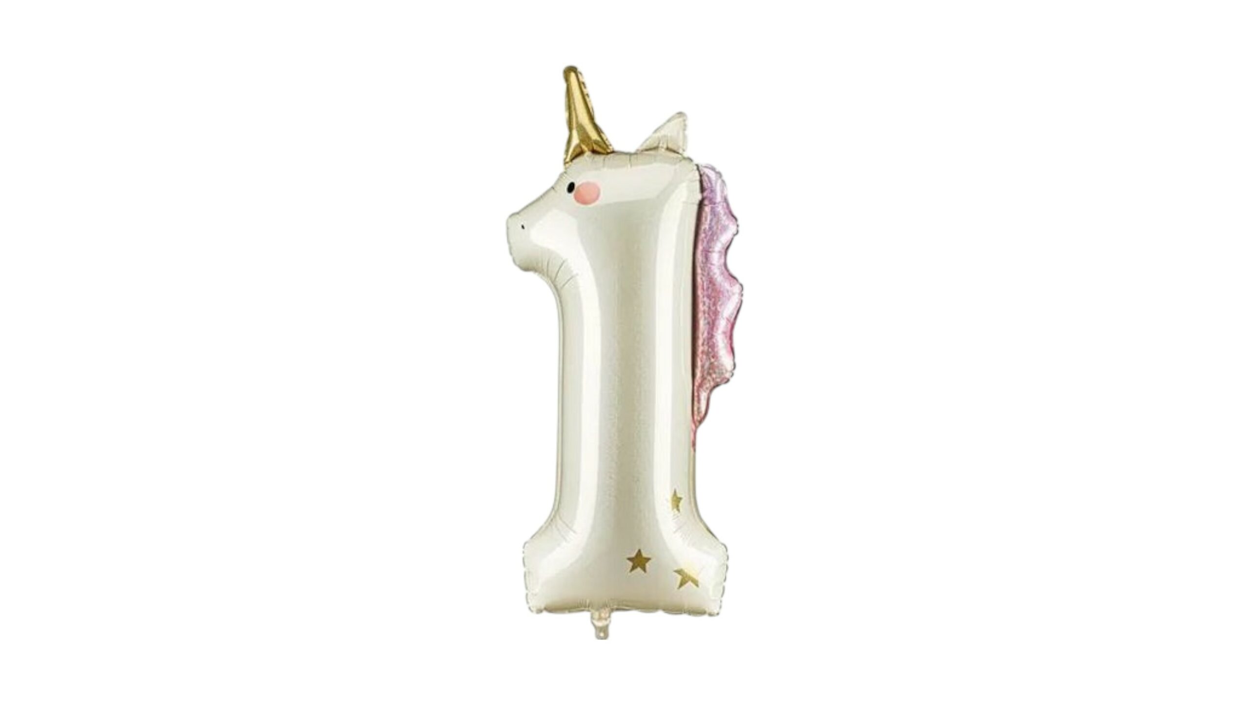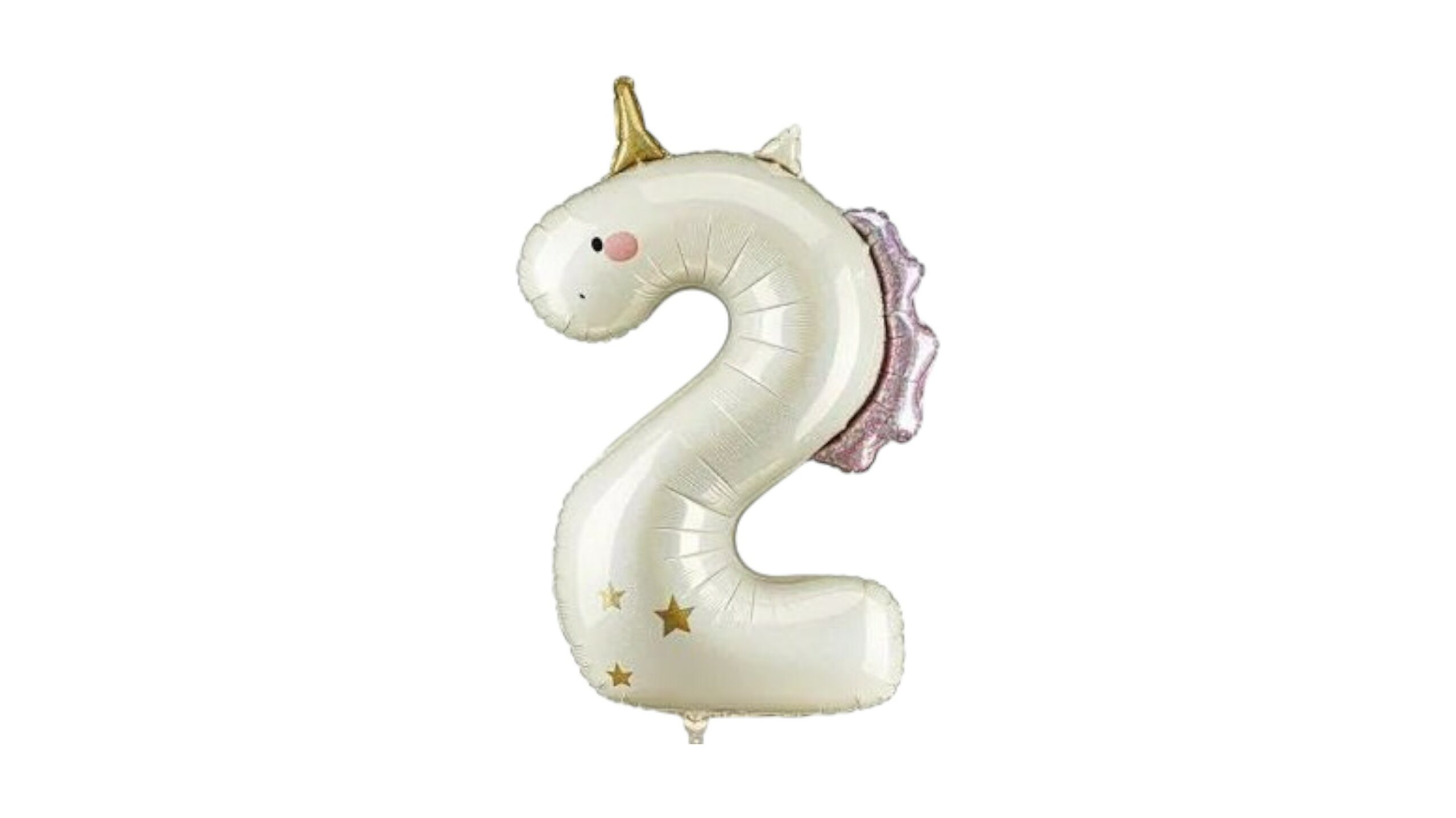 Unicorn foil balloon numbers, pre-inflation size approximately 110 cm (42”) and post-inflation size around 93 cm (38”), priced inclusive of helium and ribbon; decorative weights not included. 🎈🔢✨