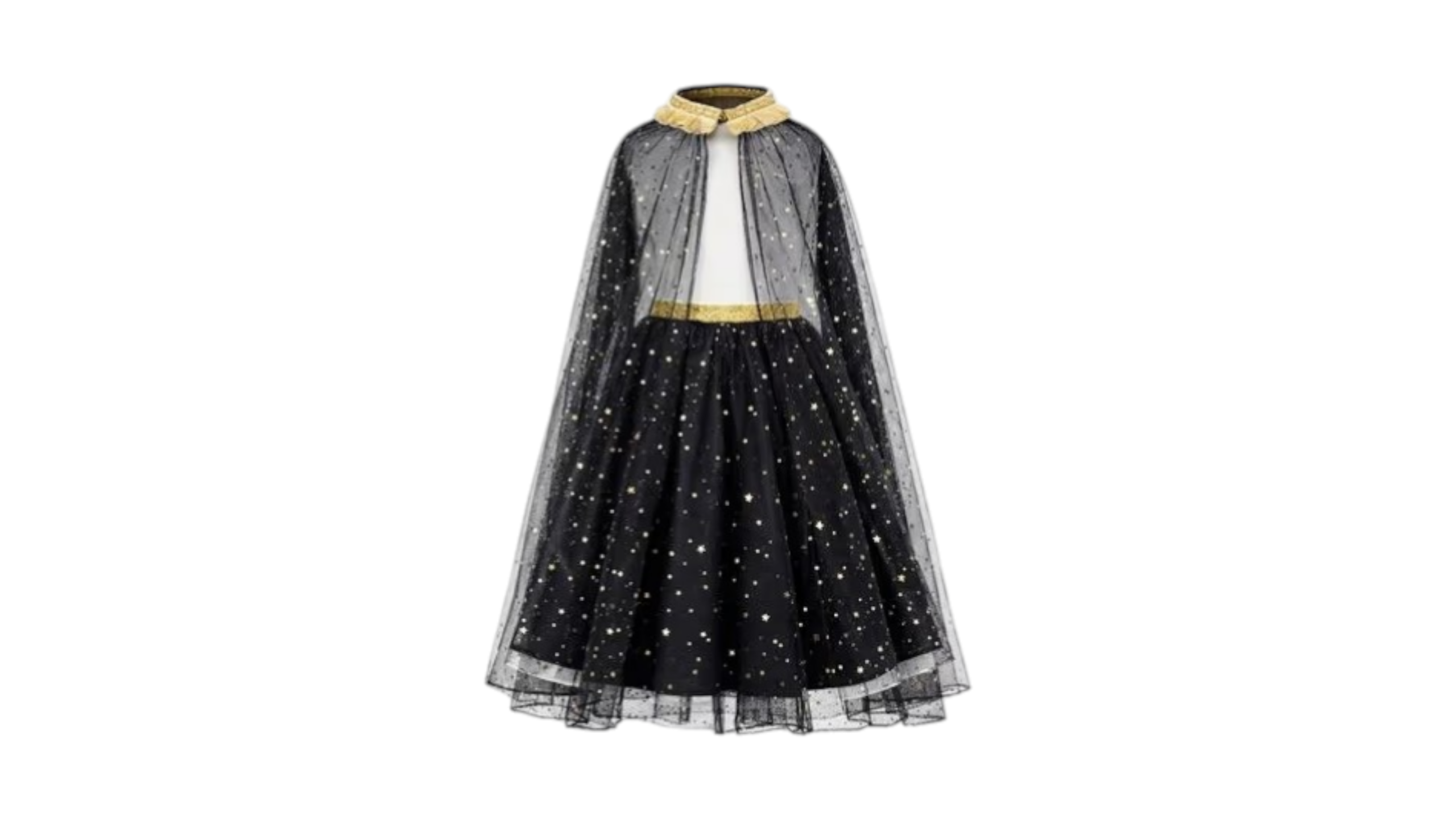 A magical outfit for little queens and fairy-tale adventures! ✨ This beautiful costume set for girls includes a black skirt and matching cape, both decorated with an elegant gold pattern. Designed for children aged 3–7 years, it’s perfect for carnival 🎭, costume parties 🎉, Halloween 🎃, and imaginative dress-up play. Easy to wear and full of charm, it instantly creates a stylish fantasy look 💫.