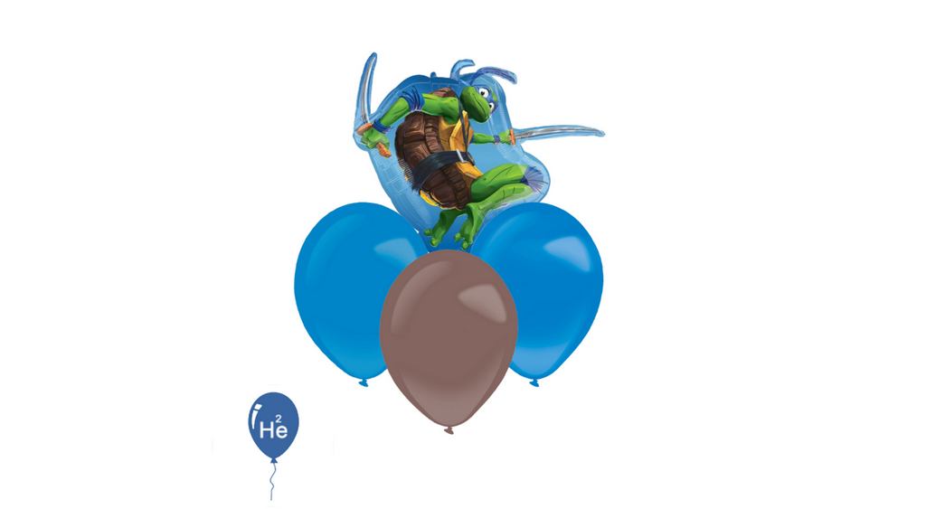 This bouquet features a supershape foil balloon of a Ninja Turtle character in an action pose with two swords. The supershape balloon is complemented by three latex helium-filled balloons—two in bright blue and one in brown. All balloons are tied together with ribbons and anchored by a balloon weight to keep the arrangement secure and upright.